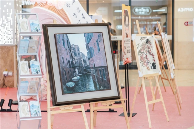 中庭另一侧的主题书画艺廊,集中展示了弘艺丰签约画家的精品力作。20组画架依次排列,独特的展示效果引得观众纷纷驻足欣赏,沉浸在传统艺术的海洋中,极大地激发了大众对传统书画的兴趣。