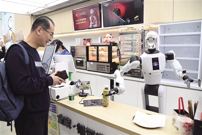 近日,在北京市海淀区中关村大街一座大厦内的便利店,机器人将抓取好的饮料交给顾客