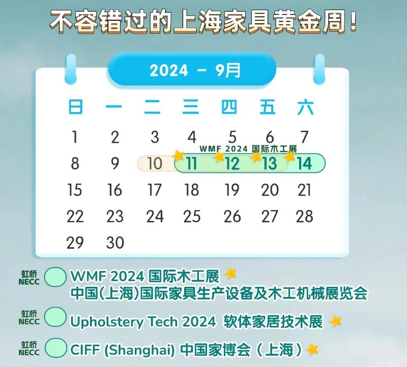 2024年9月11-14日,CIFF中国家博会将在上海国家会展中心盛大开幕,同期举办WMF上海木工展、CIFF上海软体家居展,汇聚一系列尖端整线解决方案与材料,助力家具生产更精准、更高效。